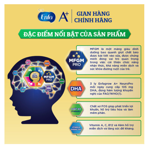 Bên trong thành phần còn bổ sung hàm lượng MFGM Pro: MFGM được viết tắt từ Milk Fat Globule Membrane là màng cầu béo, giàu dinh dưỡng có trong sữa mẹ. MFGM bao gồm phức hợp trên 150 chất béo và protein hoạt tính. Hơn nữa bổ sung MFGM trong sữa bột Enfagrow A+ số 4 870g là bước đột phá giúp thúc đẩy sự phát triển của cả tư duy (IQ) lẫn trí tuệ cảm xúc (EQ) ở trẻ nhỏ đồng thời tăng khả năng miễn dịch và sức khỏe đường ruột ở trẻ nhỏ.